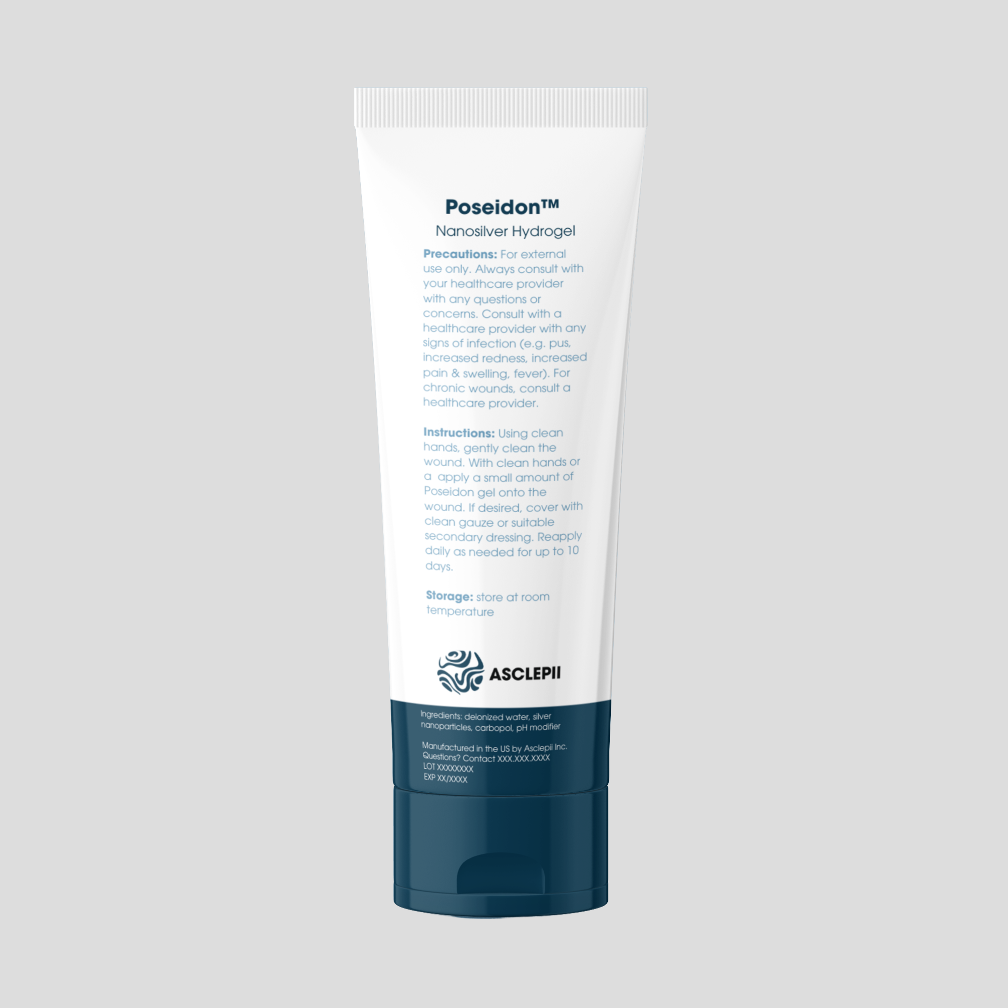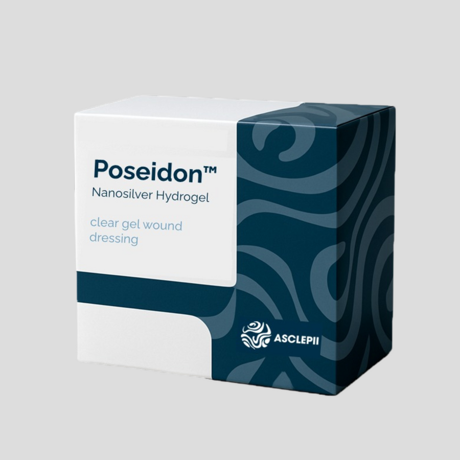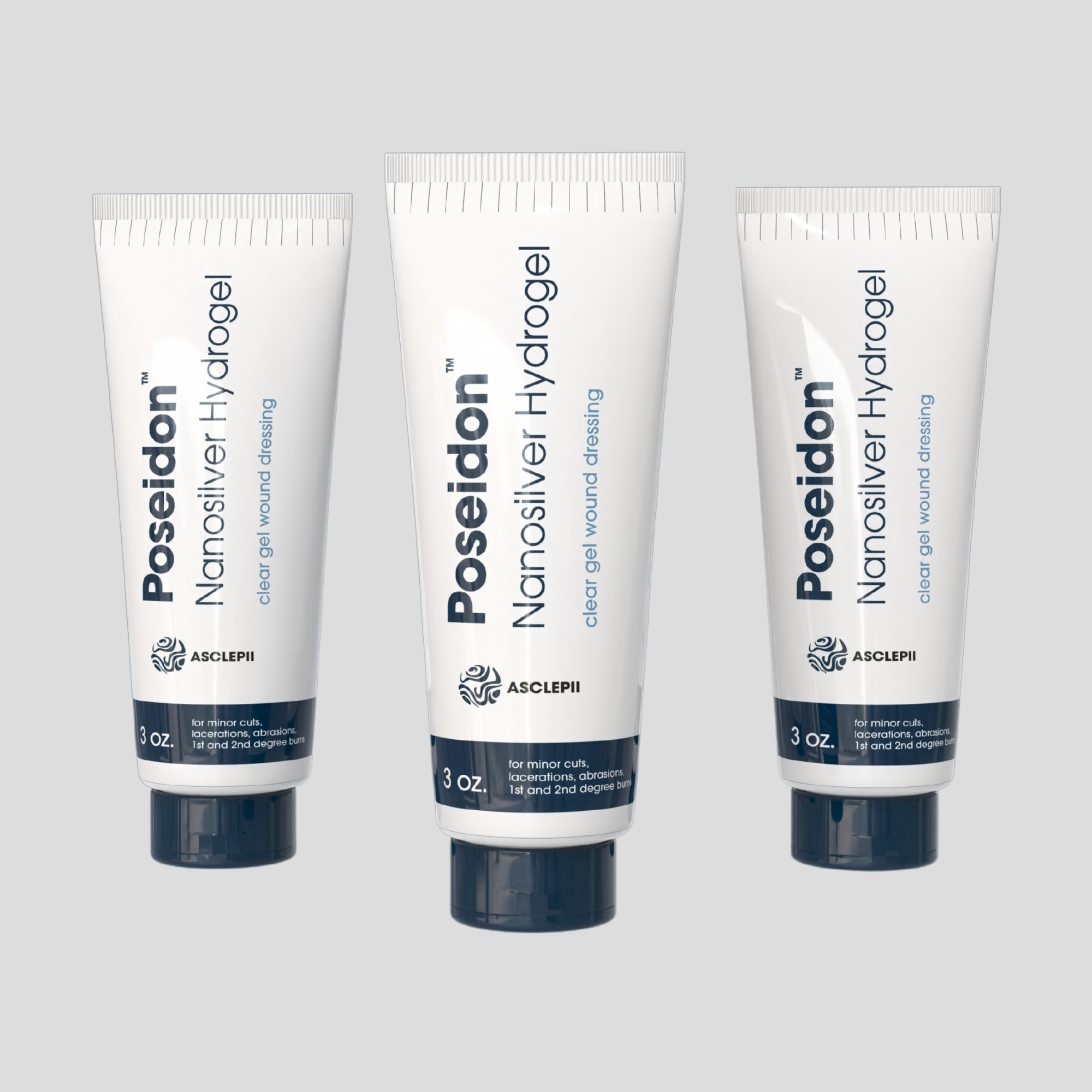 Poseidon™, a nanosilver hydrogel that helps wounds heal faster and safer. Silver is known to kill harmful microbes and disrupt biofilms, but is toxic at higher concentrations. With the lowest silver concentration on the market, Poseidon™ protects healthy tissue — reducing infection risk and speeding recovery. The future of wound care — now available (Rx and OTC).
